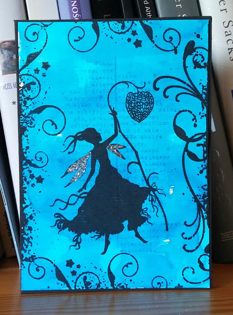 3 tła ecolinowe. To różowe zrobiłam tylko dlatego, że chciałam wreszcie wykorzystać buraczkowego distressa, bo dotąd nie miałam okazji, a okazało się, że akurat ta kartka wyszła najlepiej. Na niebieskich granatowe napisy jakoś się rozwodniły, aparat nie umie ich uchwycić ostro. Brzegi i wróżka to czarny archival. Na skrzydełkach jest glitter, ale tradycyjnie na zdjęciu nie widać, jak się błyszczy. Tym razem użyłam - zamiast Magica - kleju w pisaku ZIG. Wspominam o tym, bo odradzam! Klej w pisaku się nie nadaje do brokatu, jakoś tak odstaje i brokat potem dziwnie wygląda.